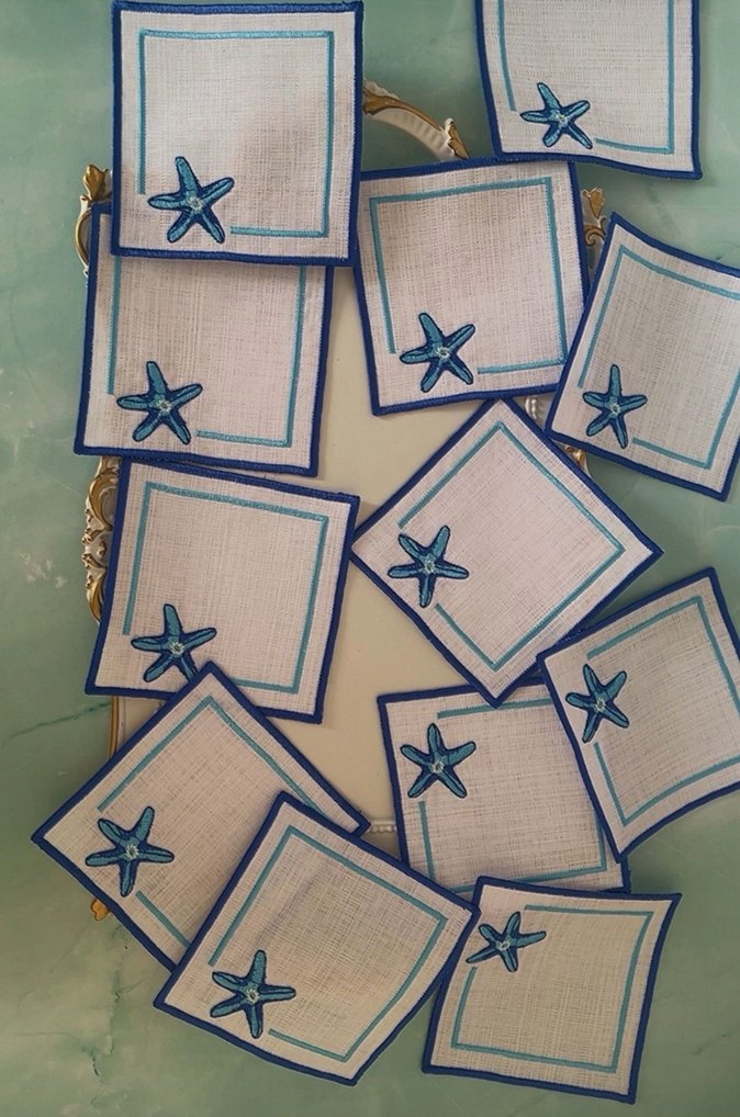 Mavi işlemeli deniz yıldızı deseni ve mavi kenarlığı ile sade ve şık. Kahve sunumlarınıza eşlik edecek güzellik. İster 6lı isterseniz tek adet olarak satılır
