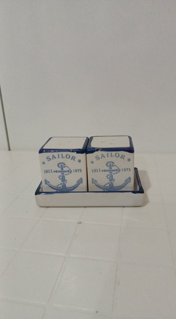 Mavi ve gri renklerde, denizci çapa desenli tuzluk ve biberlik seti, üzerinde küçük bir tepsi ile birlikte. ⚓ ihtiyaç fazlası az kullanıldı temiz 3 parça