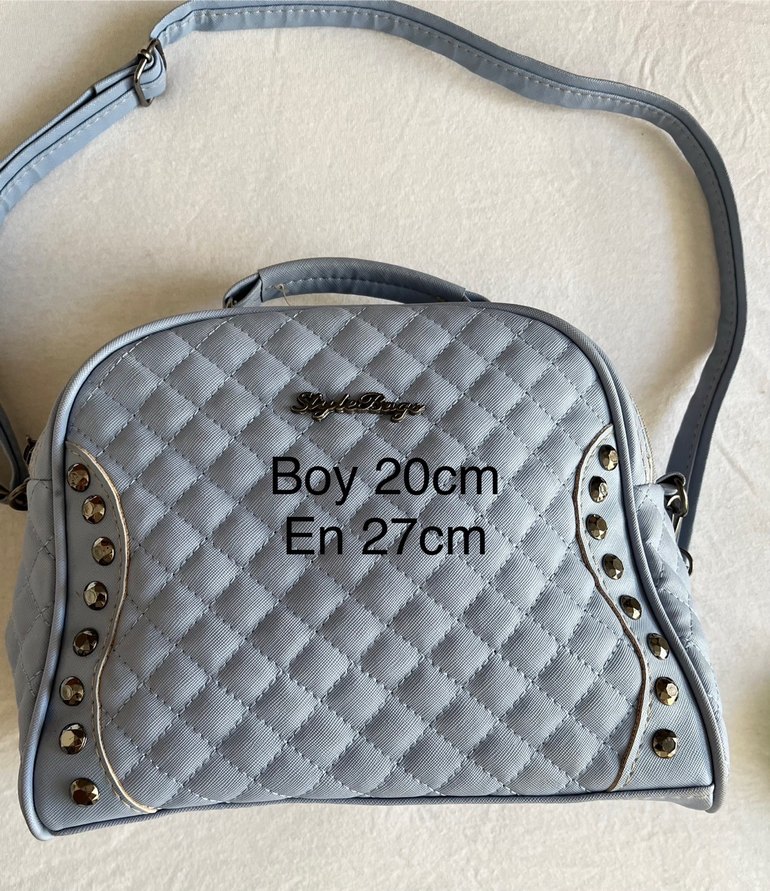 Mavi deri biker tarzı kadın çanta, kapitone desenli ve fermuarlı. Boyu 20cm, eni 27cm