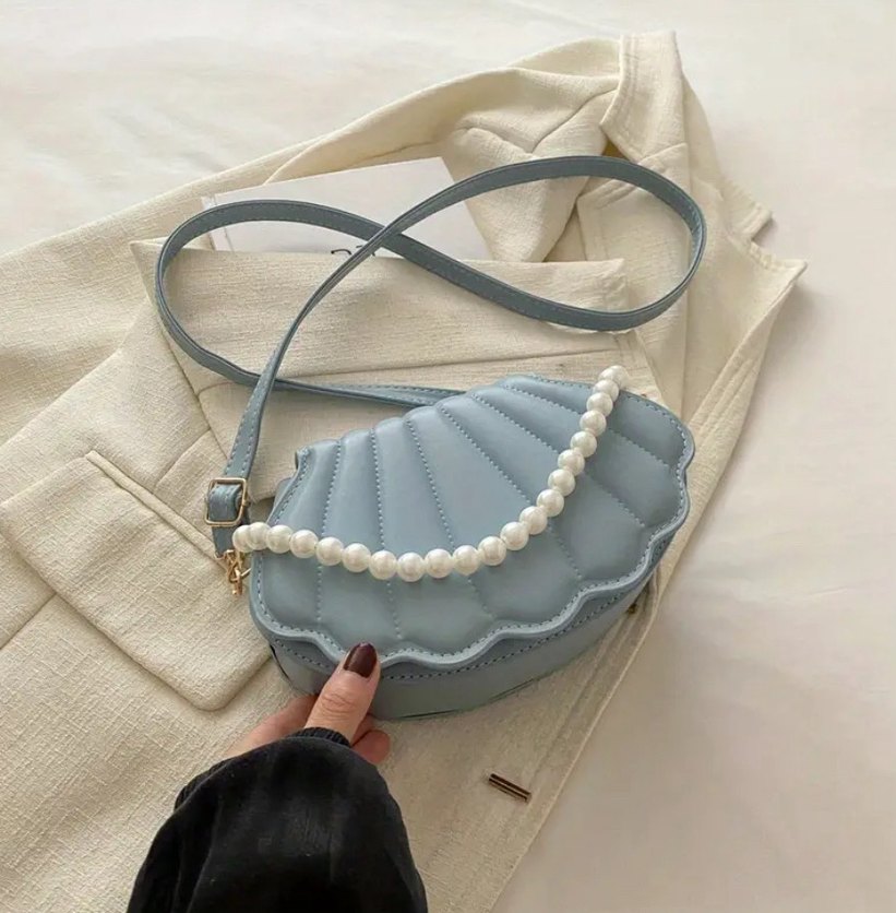 Pastel mavi deri çanta, boncuklu sap ve nakışlı bohem desenle trendi günlük kullanıma uygun.