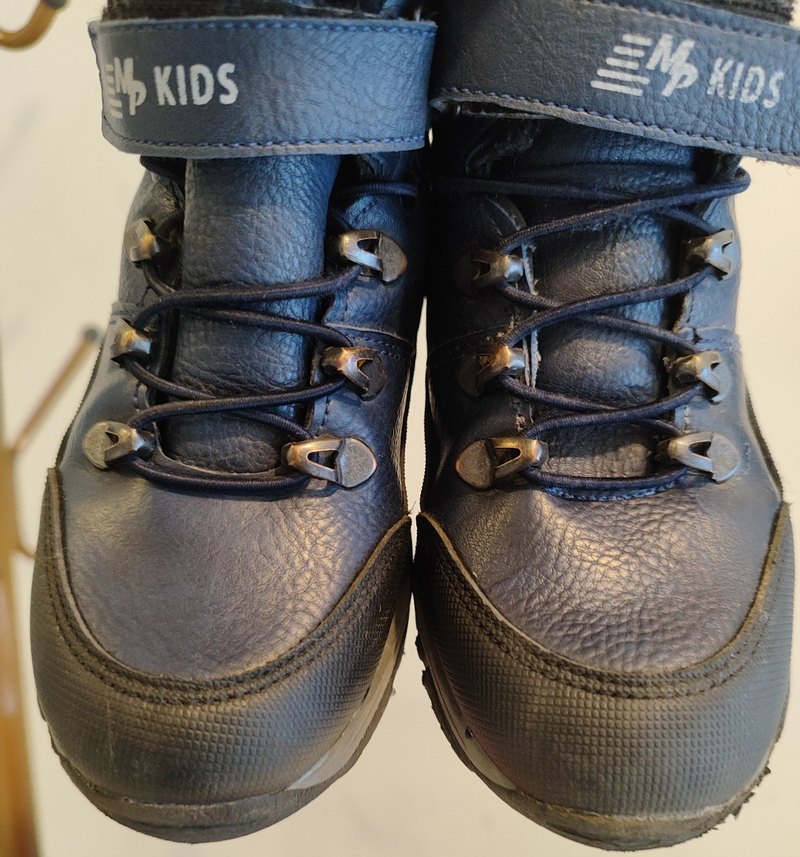 Mavi deri ve tokalı, bağcıklı, lacivert tonlu erkek çocuk biker botlarıdır.