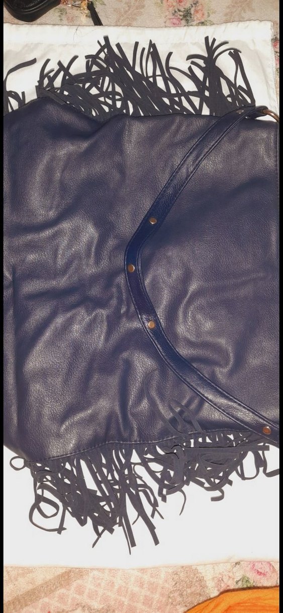 Fermuarlı kapama ve püskül detaylı koyu mavi deri biker tarzı kadın çantası, sokak stili ve rock punk havası yansıtıyor.