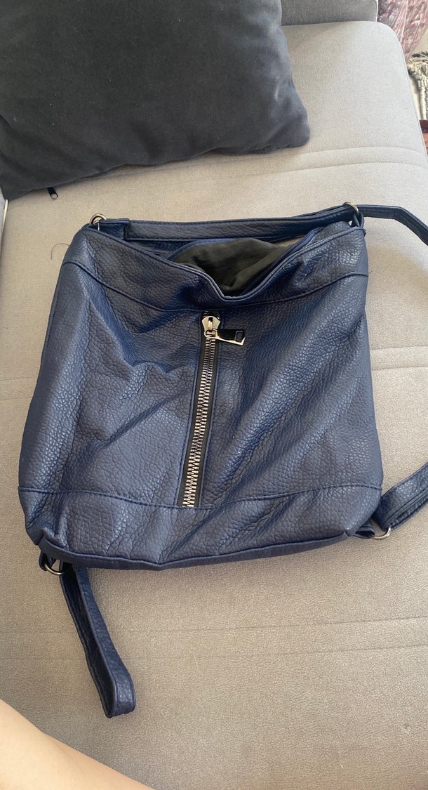 Mavi deriden yapılmış, fermuarlı ve desensiz tasarıma sahip kadın çantası. Minimalist ve günlük sokak stili için uygun.