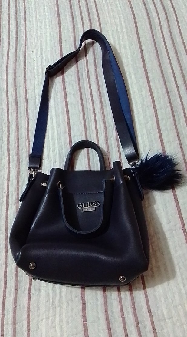 GUESS markalı, püsküllü ve baskılı desenli mavi deri kadın çantası, günlük kullanım ve sokak modası için uygun. ✨ çantada hiç bir kusur yok