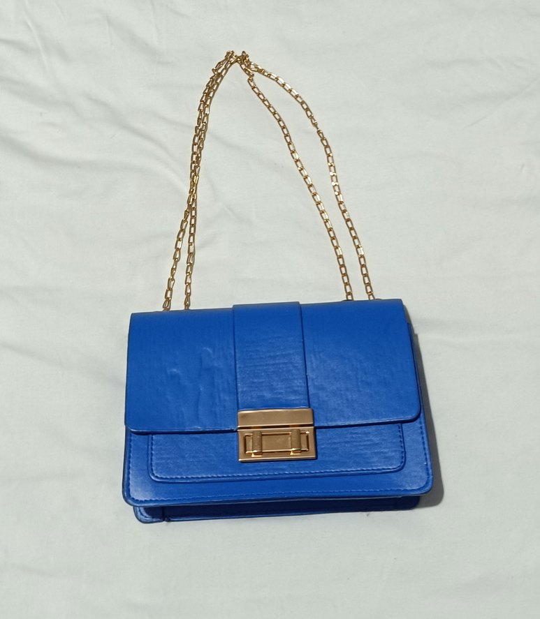Mavi deri, tokalı kapamalı ve altın zincir askılı kadın çantası. Modern klasik Paris tarzında, desen içermeyen renkli tasarım.