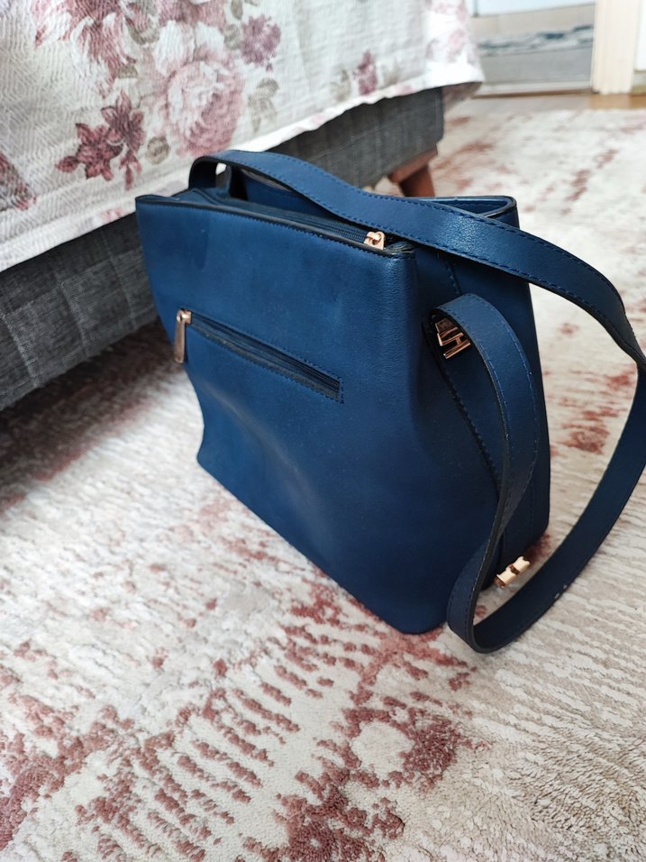 Parlak mavi deriden yapılmış, tokalı kayışlı, minimalist ve çağdaş tasarıma sahip günlük kullanıma uygun kadın çantası Büyük boy hiç bir kusuru yok sadece etiketi yok