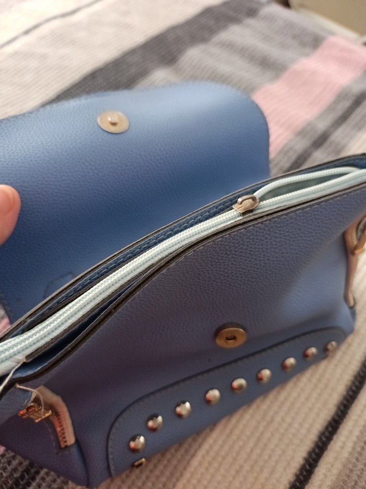 Mavi deri kadın çanta, fermuarlı bölme ve metal süslemelerle Paris bohem stilini yansıtır. Günlük kullanıma uygundur.