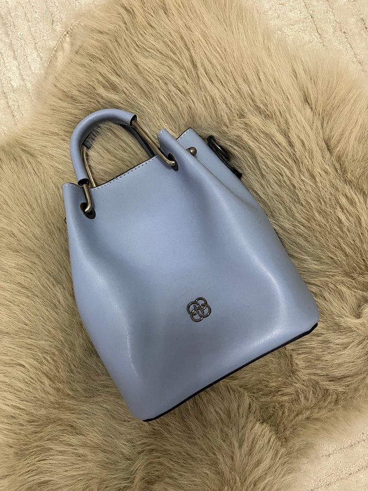 Pastel mavi deri kadın çanta, modern klasik tasarıma ve tokalı detaylara sahiptir. Minimalist tarzı, günlük şık kullanıma uygundur.