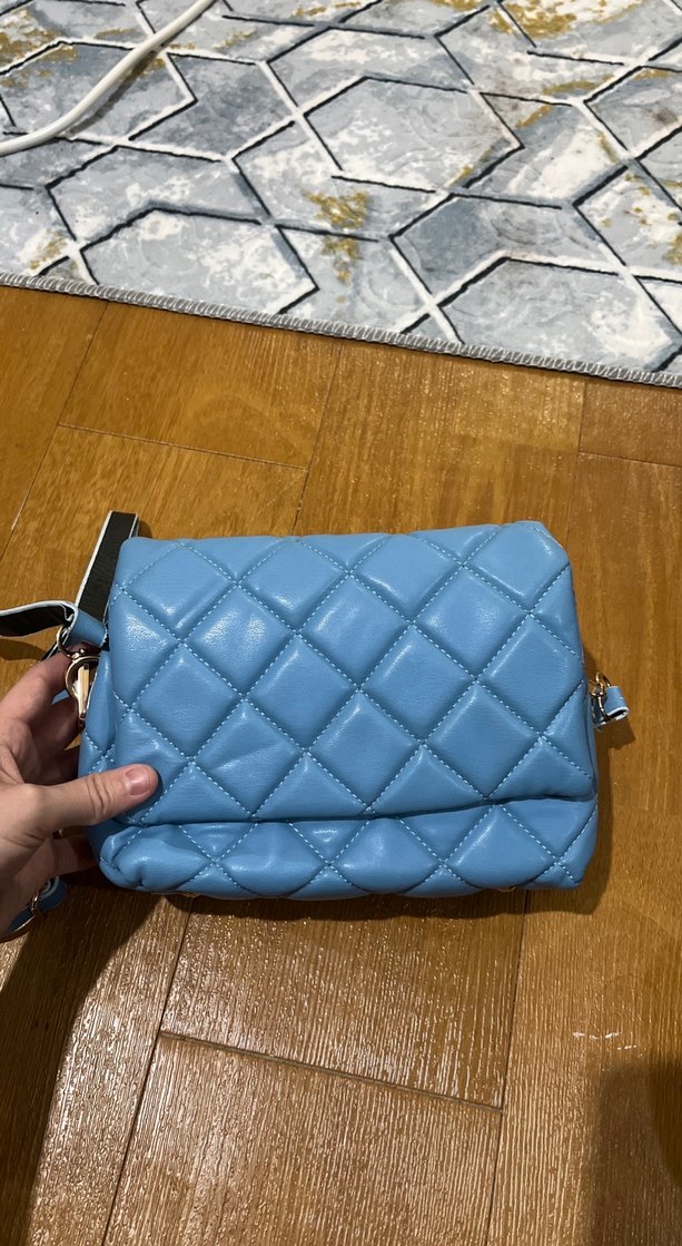 Pastel mavi deri kadın çanta, kapak kısmında tokalı ve kapitone desenlidir. Günlük sokak tarzına uygundur.