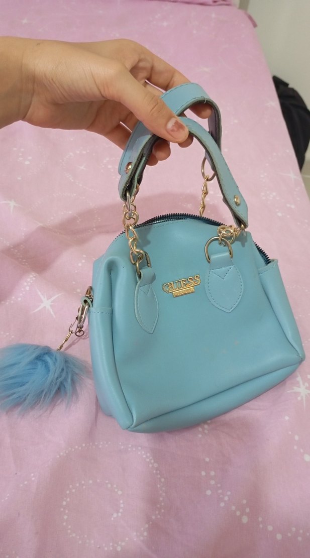 Pastel mavi deri kadın çanta, fermuarlı ana bölme ve baskılı desene sahiptir. Trendy günlük sokak stiline uygundur. Yumuşak mavi ponpon aksesuarı bulunur.