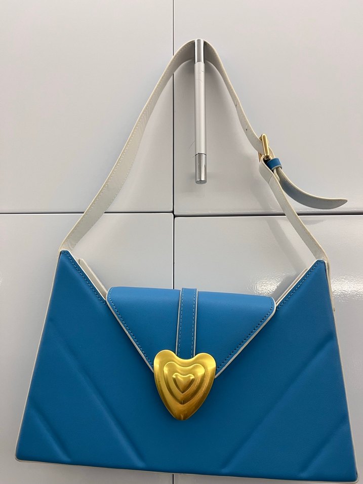 Mavi deri kadın çanta, kalp şeklinde altın tokası ve baskılı detaylarıyla çağdaş, avangart stil için uygun.hiç kullanılmamıştır