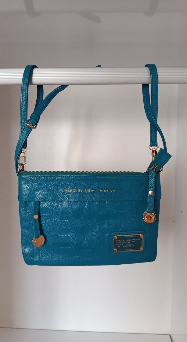 Mavi deri kadın çanta, tokalı askı ve baskılı desene sahiptir. Parlak yüzeyi ve "ENINA-FARMINA" yazısı bulunur. Günlük ve sokak stiline uygundur.