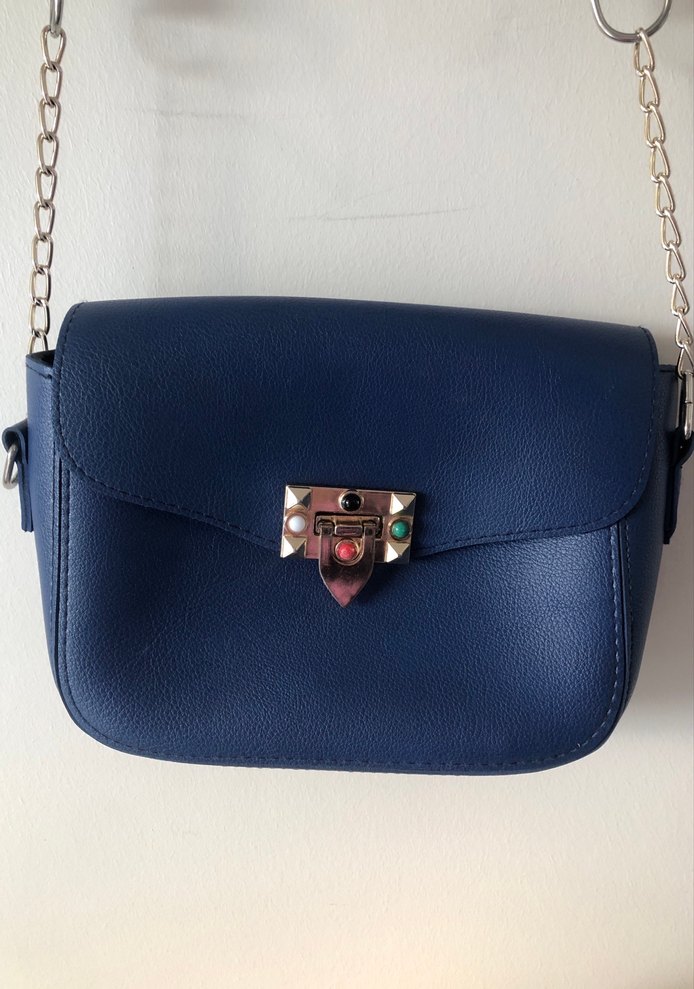 Mavi deri kadın çanta, tokalı kapanış ve zincir askıya sahip. Cesur biker tarzı ve Paris etkisiyle günlük kullanıma uygun.