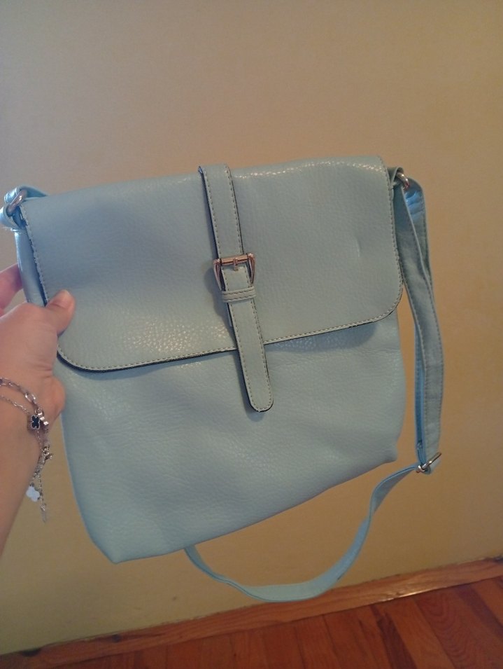 Pastel mavi renkte, tokalı kapaklı ve ayarlanabilir askılı deri kadın çantası, sade ve bohem tarzda günlük kullanım için uygundur.
