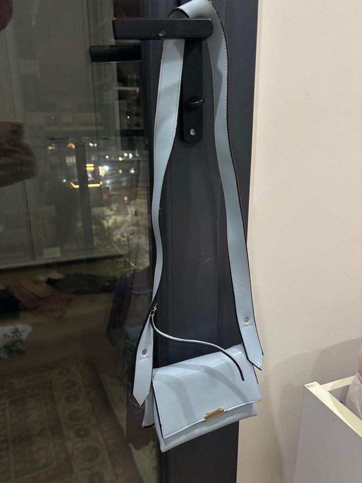 Pastel mavi deri kadın çanta, tokalı askıya sahip