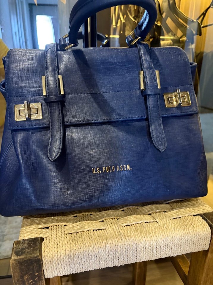 Mavi deri çanta, tokalı detayları ve baskılı deseni ile parlak bir görünüme sahip. U.S. Polo Assn. logosu bulunur, ofis için modern klasik tarzda.