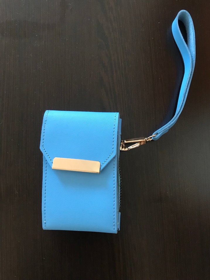 Pastel mavi renkte deri kadın cüzdanı, kemerli tasarıma ve baskılı desene sahiptir. Minimalist sokak stili için günlük kullanıma uygundur. Bileklik askısı bulunur.
