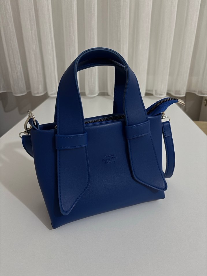 Mavi deri el çantası, tokalı detaylara sahip, minimalist ve çağdaş tarzda, günlük kullanıma uygun. Düz ve desensiz yüzeyi, sağlam sapları vardır.