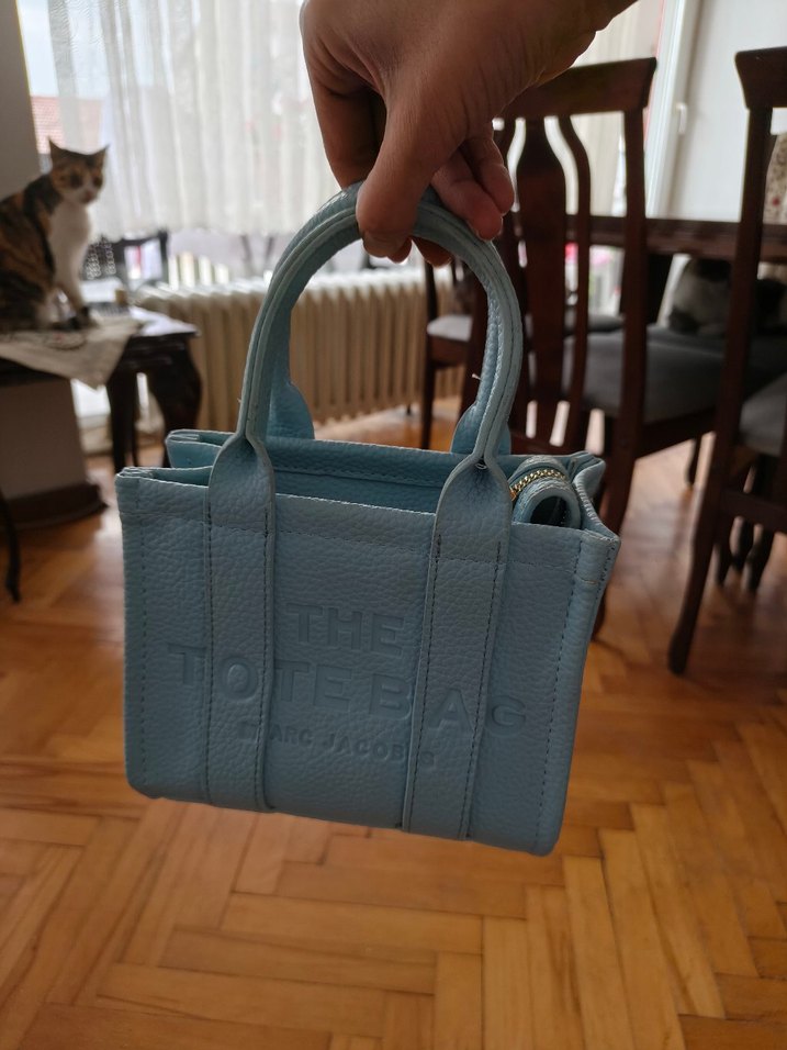 Pastel mavi deri, baskılı ve fermuarlı kadın el çantası. Paris esintili, trend sokak stili için uygun.