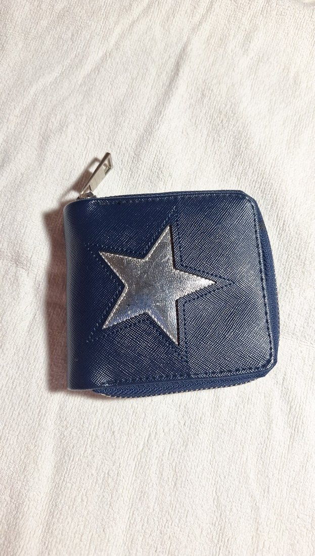 Parlak mavi deri kadın cüzdan, fermuarlı kapama ve nakışlı yıldız deseniyle Parisli karşı kültür tarzını yansıtıyor.