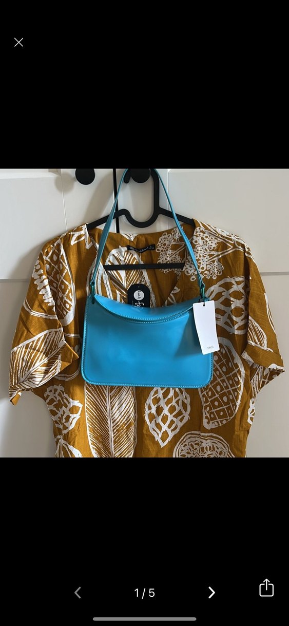 Mavi deri kadın omuz çantası, kemerli tasarımı ve baskılı deseniyle günlük kullanıma uygun bohem tarzda.