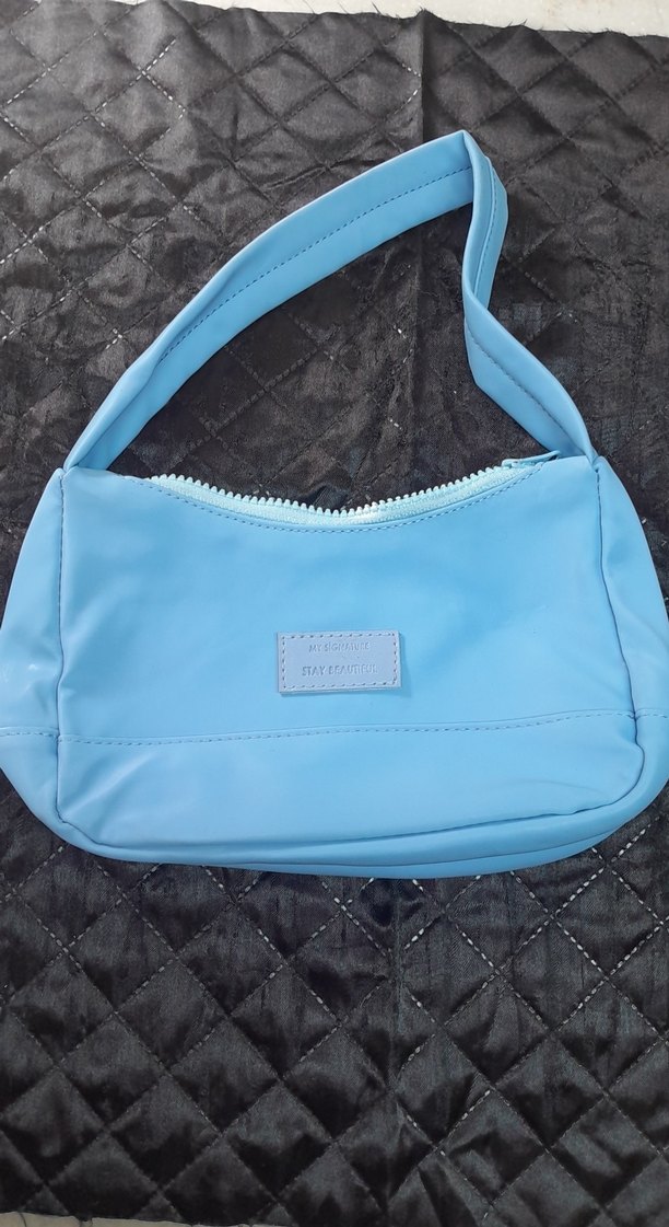 Pastel mavi deri kadın çantası, fermuarlı ve tek omuz askılıdır. Düz ve desen içermeyen tasarımıyla günlük kullanıma uygundur.