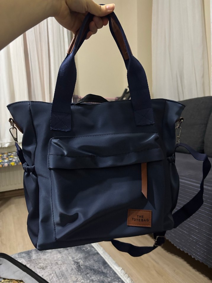 Koyu mavi renkli, tokalı detaylara sahip deri kadın omuz çantası. Baskılı deseniyle sokak stiline uygun.