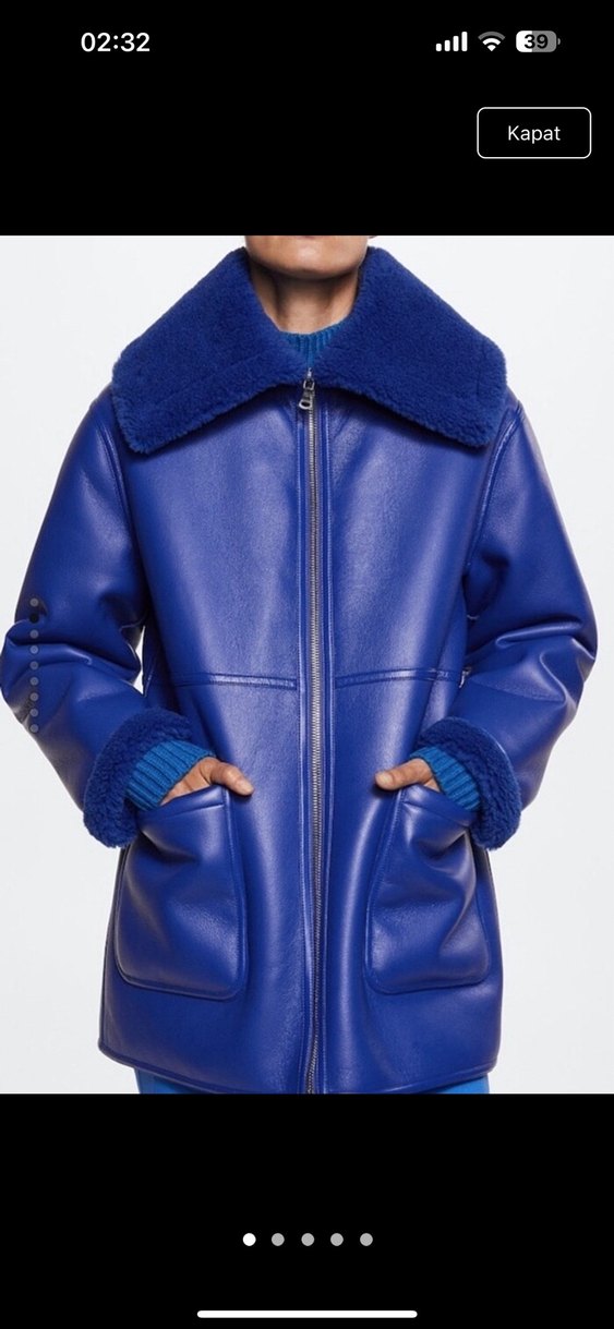 Parlak mavi deri ceket, kürklü yakası ve manşetleriyle dikkat çeker. İnce kesim, midi boy ve kesik yaka stilindedir.