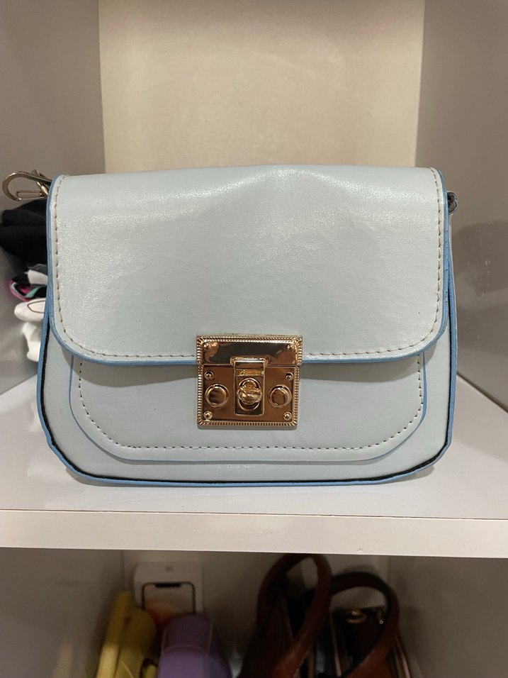 Pastel mavi renkte deri kadın çantası, tokalı kapama ve modern klasik tasarıma sahip, günlük kullanım için Paris tarzında şık bir seçenek.