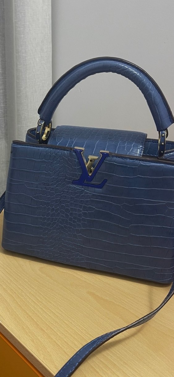 Mavi deri, parlak yılan desenli ve tokalı kadın çanta, klasik zarafet ile çağdaş Paris tarzını günlük kullanıma sunar.