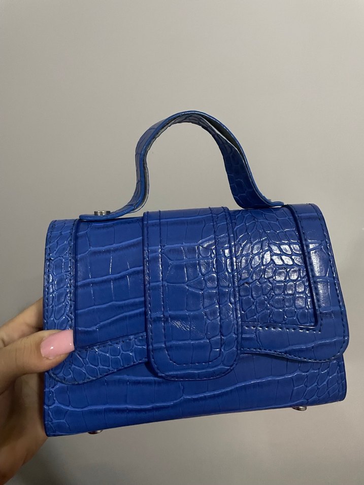 Parlak mavi yılan desenli deri kadın çanta, tokalı kapak ve elde tutma sapına sahiptir, trend sokak modasına uygundur. Sap kısmında bir defo var 1 veya 2 kere kullanıldı.