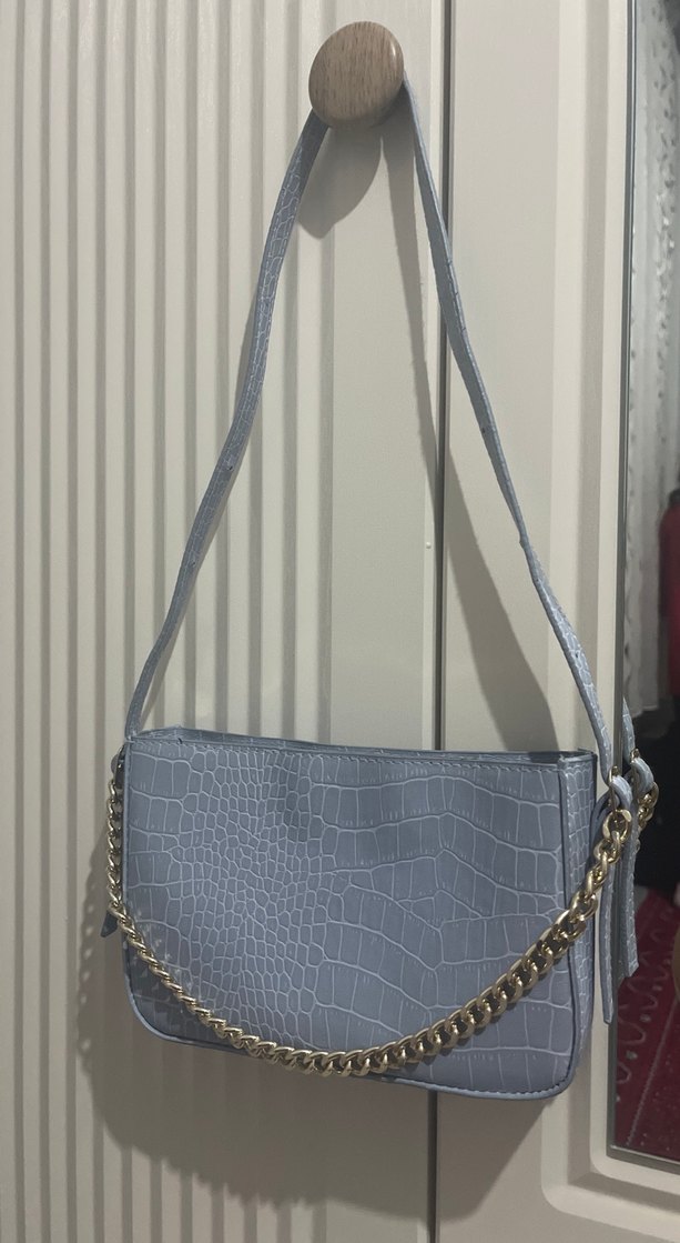 Gri deri yılan desenli kadın çantası, altın renk zincir detayıyla dikkat çekiyor. Uzun askılı, günlük sokak stiline uygun.