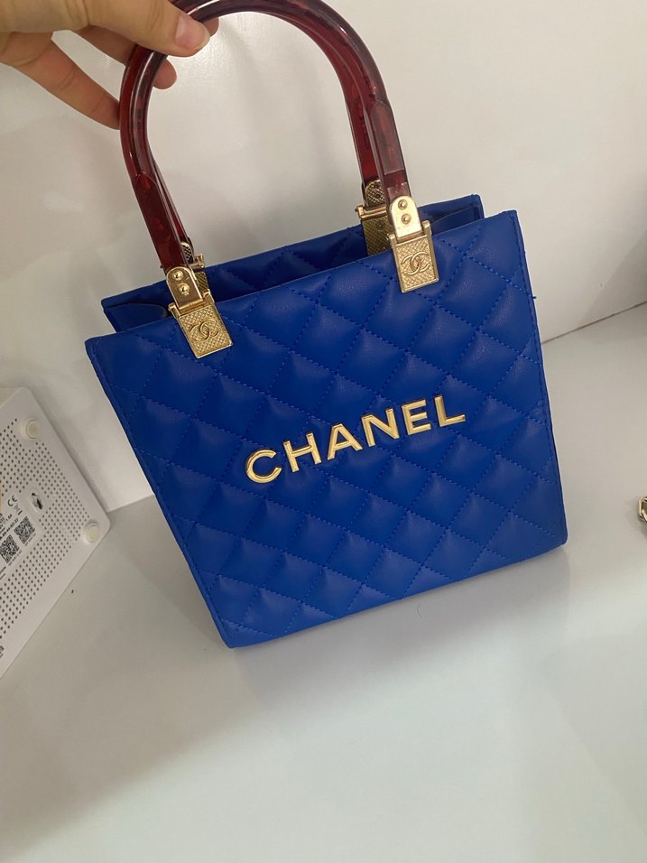 Mavi deri çanta, parlak kapitone deseni ve zincir detayları ile dikkat çeker. CHANEL logosu önde, modern klasik tarzda, günlük kullanıma uygun.