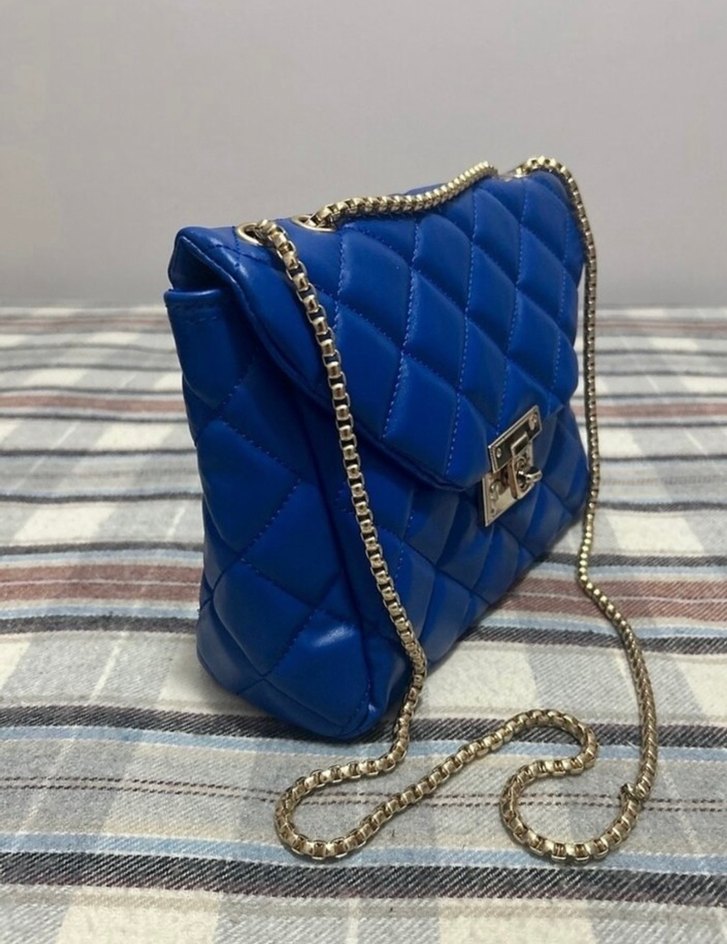 Mavi deri, zincir detaylı, kapaklı ve kilitli kadın çantası.