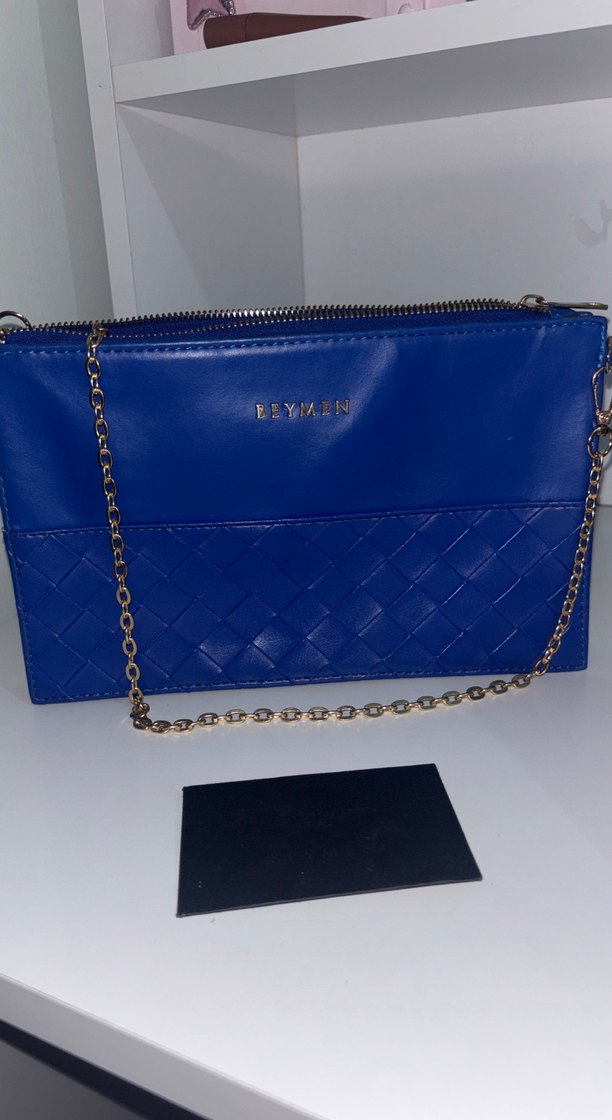 Mavi deri kadın çanta, fermuarlı üst kısmı ve parlak baskılı deseniyle dikkat çeker. Zincir askılı klasik Paris sokak tarzında, günlük kullanıma uygun. Orijinaldir 25 en 15 boy