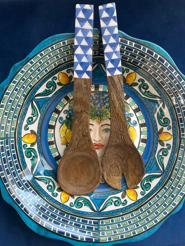 Mavi geometrik desenli saplara sahip ahşap servis kaşıkları, detaylı desenli bir tabak üzerinde. Salata ve yemek servisi için uygun.