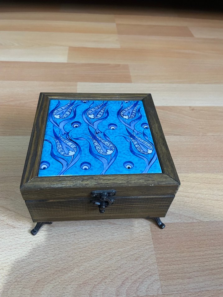 Mavi desenli üst yüzeye ve metal kilide sahip, dört küçük ayak üzerinde duran ahşap takı kutusu.