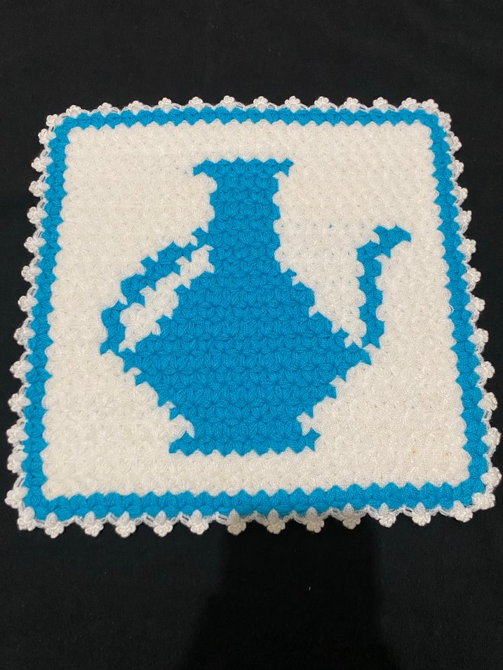Mavi ve beyaz renklerde, çaydanlık desenli, dokulu el yapımı banyo lifi.