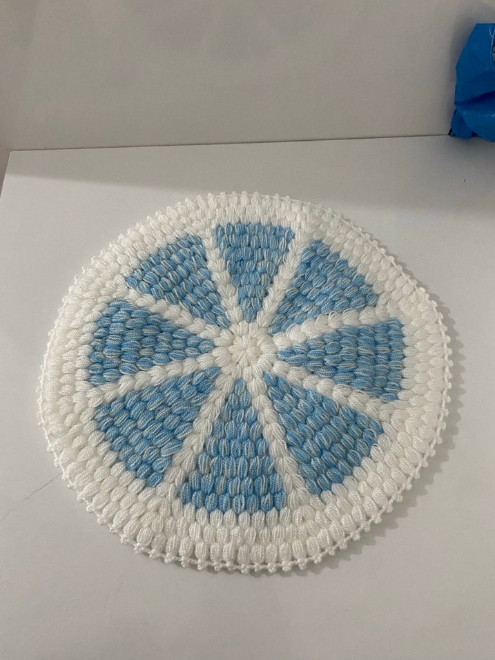 Açık mavi ve beyaz desenli yuvarlak banyo süngeri, nazik temizlik ve peeling için uygundur.