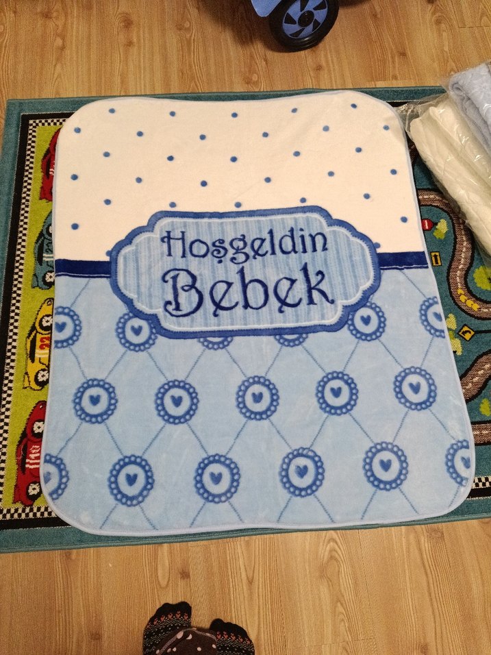 Renkli, yumuşak ve sıcak kumaştan yapılmış, 'Hoşgeldin Bebek' yazılı baskılı bebek battaniyesi.