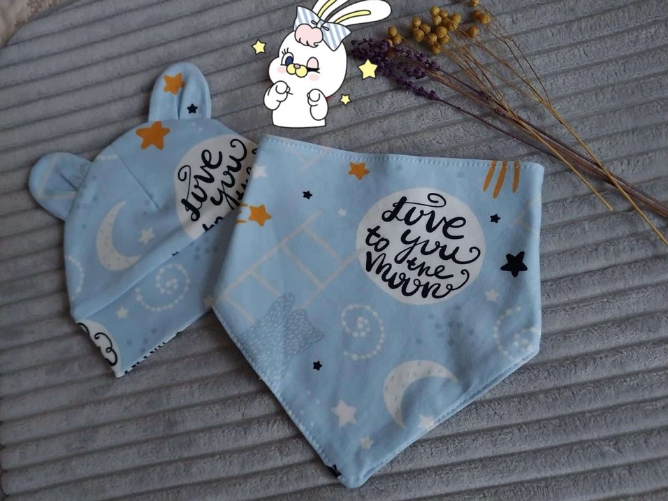 Pastel mavi renkte, baskılı desenlere ve "dove" yazısına sahip bebek önlüğü. Yumuşak kumaştan üretilmiştir.