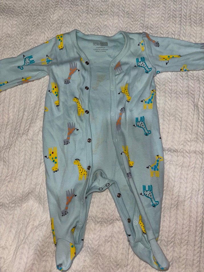 E bebek ürünüdür. Bu bebek tulumu uzun kollu, yüksek yakalı ve düğmeli kapamalıdır. Yumuşak ve sıcak kumaştan yapılmış, pastel mavi zemin üzerinde renkli zürafa desenleri vardır. Bebeğim sadece 1 defa giydi