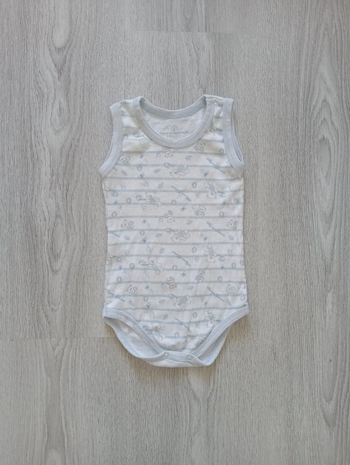 Yuvarlak yaka, kolsuz ve örme dokulu beyaz mavi bebek body. Mavi desenlerle süslenmiş, yumuşak ve rahat bir yapıya sahiptir.