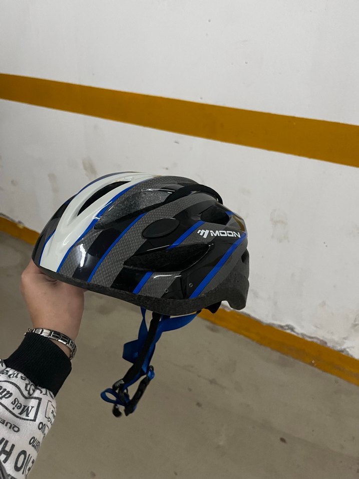 Plastik malzemeden yapılmış, koyu mavi renkli ve desenli biker kask. Velcro bantlı, rock punk havası taşıyan athleisure tarzında. Sıkıntısız