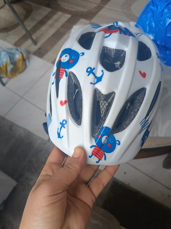 Renkli mavi baskılı desenlere sahip plastik bisiklet kaskı, Velcro bantlarla güvenli kullanım sağlar.