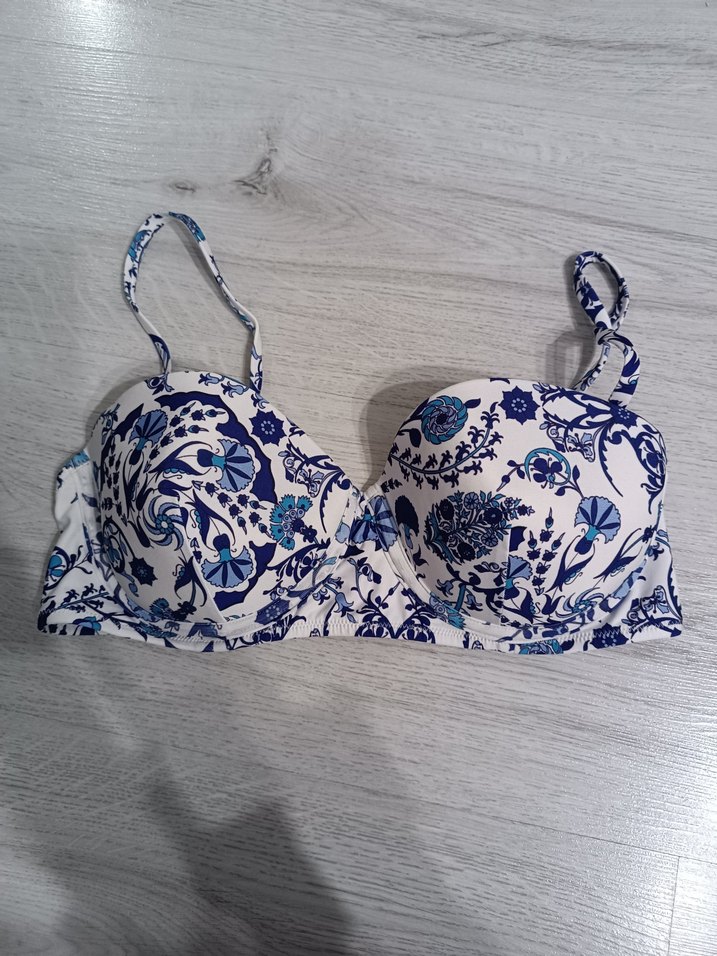 Mavi desenli, dantel detaylı, bohem tarzda, askılı ve vücuda oturan bikini üstü.