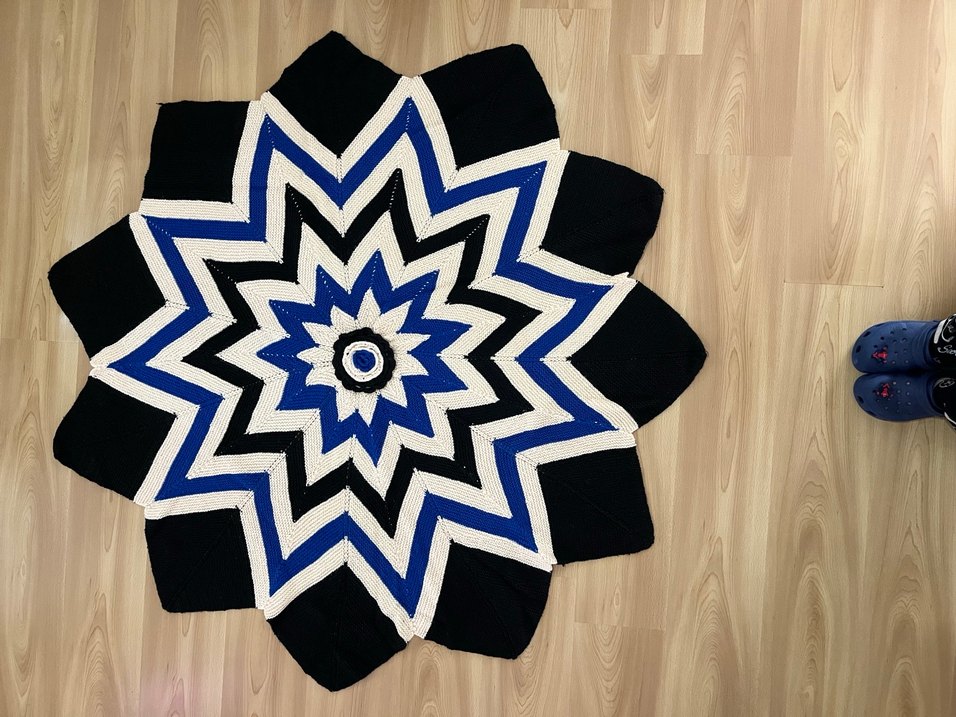 Bohem tarzda, koyu mavi, beyaz ve siyah detaylı yıldız desenli, özgün şekilli halı. El örmesi kilim