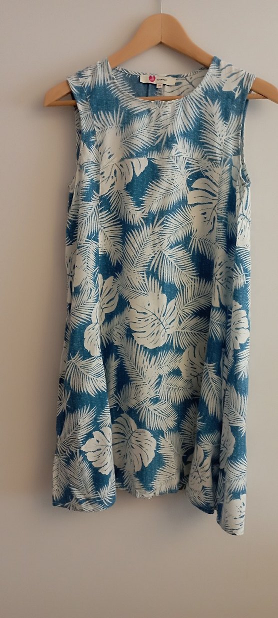 Mavi tonlarında, straplez yakalı ve bol kesim tunik, bohem tarzı ve dökümlü tasarıma sahiptir. Astarı yoktur. İnce keten viskoz karışımı kumaş. Dördüncü fotoğrafta gösterilen kusurundan başka kusur yoktur. Tarz olarak hamilelere de uygundur. Etikette 34 beden ancak 38 bedende dahil rahat olur.
