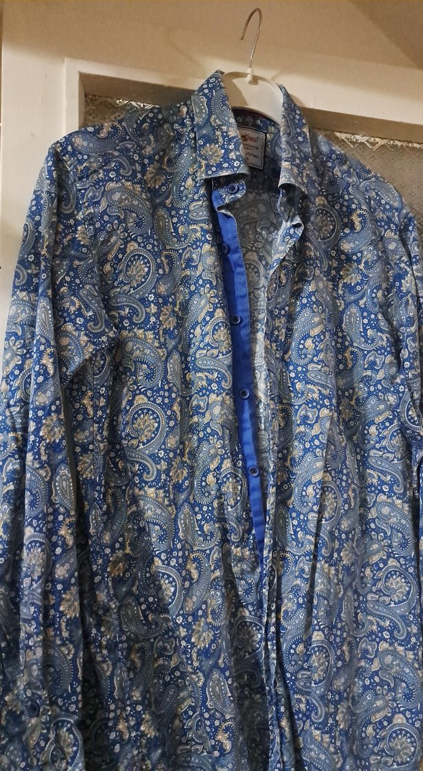 Mavi parlak desenli, uzun kollu ve düğmeli bohem tarzda bol kesim erkek gömlek. Yakalı ve uzun boylu tasarım. muhteşemmm kalitede, deseni harika , ister kullanımlık ister hediyelik