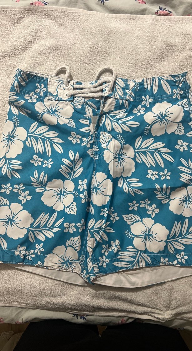 Açık mavi renkte, çiçek desenli, düğmeli ve fit kesimli erkek mayo. Bohem tarzıyla plajda kullanıma uygun.